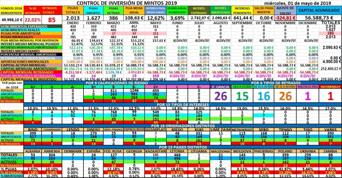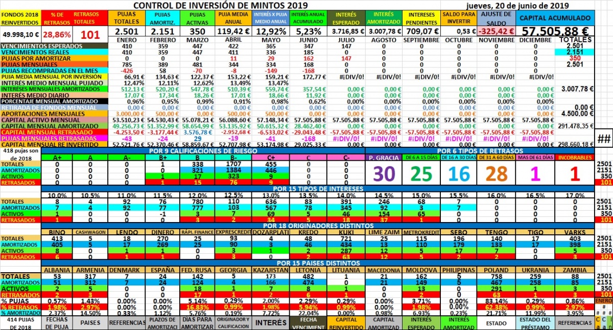Asi fue mayo, con muchos retrasos que se amortizaron con la garantía, muchos altibajos con el porcentaje de interes, pero se mantiene estable, el originador DINERO fue un error, todos los que tenia no pagaron ni la mitad de intereses por no pagar retrasos. En junio aun va mejor el interese y hay mucha oferta, aunque ya acumulo 100 retrasos y estoy acumulando casi todo en Kuki al 15%, no me funciona el autoinvest, tengo que pujar todos los dias manualmente lo amortizado, me dicen en mintos que es porque me adelanto, que ellos invierten a media tarde, y no lo entiendo porque a las 8 de la mañana ya hay de sobra para invertir ¿porque esperar a la tarde?.