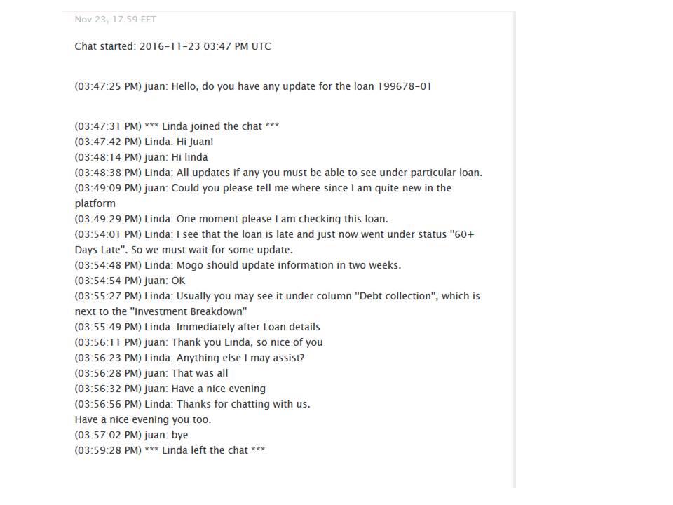 Acojonante el servicio de Mintos. Esto es un plus en mi opinión y que deberían de tener todas las plataformas, un chat en vivo para resolverte tus cuestiones y no tener que mandar un mail y esperar a ver si te quieren responder.