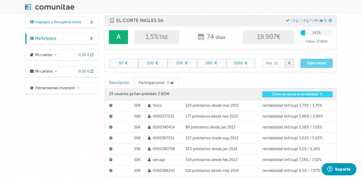 Ayer 19-12-2016 publicó una operación del tipo "A" que remuneraba el 1,5% de interés al inversor cuando Comunitae cobra un 2% de comisión a los prestamistas (subo pantallazo abajo). Negocio redondo para Comunitae porque cobra su comisión y ruinoso para los inversores porque, suponiendo que cobren, van a perder el 0,5%. Enlace al post de ayer: http://www.forofintech.org/experiencia-comunitae-3147 Algunos pensábamos que era un error. Pero no, lo ha vuelto a hacer y esta vez nos ofrece una estupenda operación de inversión. Un pagaré de El Corte Inglés al 1,5% pero recuerda... Comunitae te cobra el 2%. ¿Quieres perder un 0,5%? El problema es que ha habido algunos inversores que han entrado porque tenían activado el automático para préstamos de tipo "A". ¿Está de coña Comunitae? Esto es intolerable y denunciable.