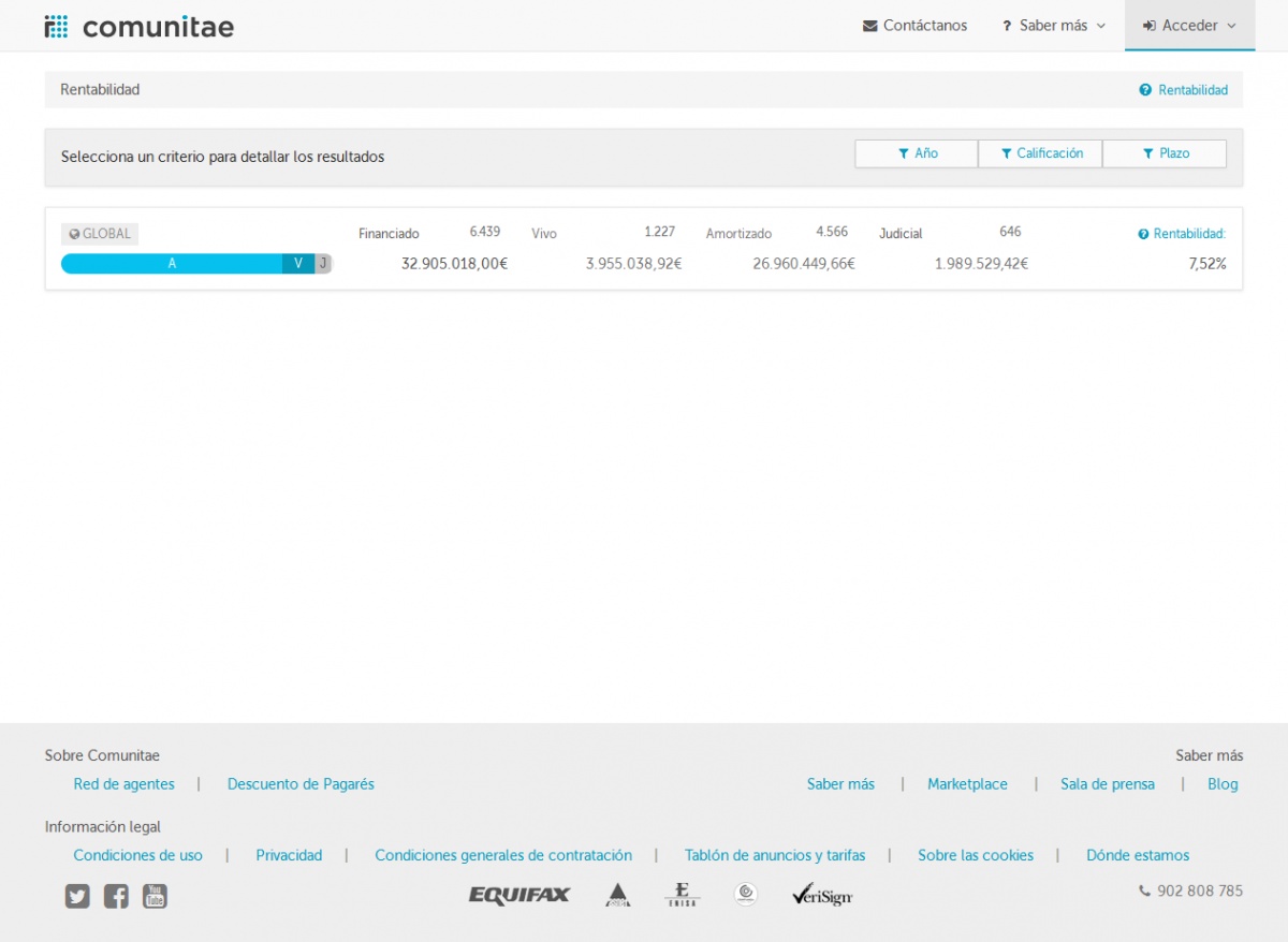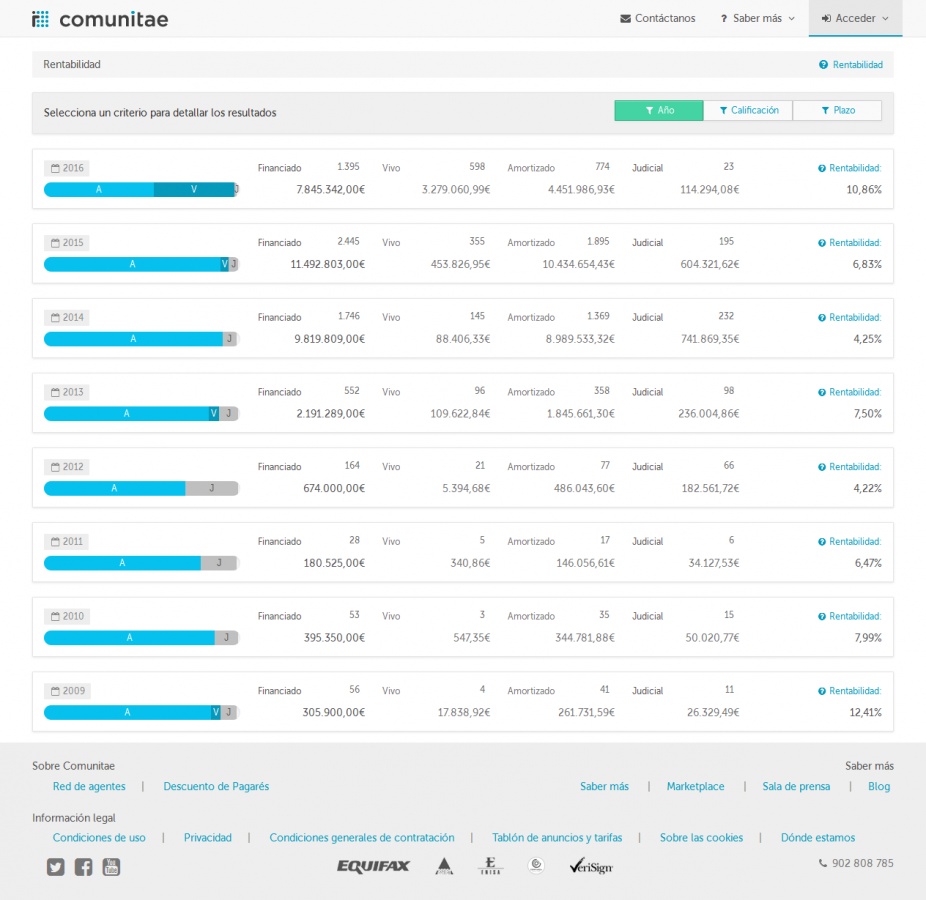 Un día me dio por hacer números y me di cuenta que la supuesta rentabilidad que publicaban en la página web era falsa, y ello, basado en los propios datos que Comunitae mandaba en sus resúmenes mensuales. El último email es del 1-10-2016 y muestra las siguientes magnitudes: - El mes pasado (septiembre 2016) han conseguido 118 clientes nuevos - El mes pasado (septiembre 2016) 1.103 clientes han prestado 1.002.776 € en 128 préstamos a un tipo medio del 11% - Hasta la fecha (desde 2009), los clientes han pestado 32.937.018 € y se han pagado 1.661.827,63 € en intereses. ![]() En su página web mostraban sus estadísticas. Yo saqué dos pantallazos el día 3-10-2016 (uno agregado y otro por años) y mostraba lo siguiente: - Financiado: 32.905.018 € - Vivo: 3.955.038 € - Amortizado: 26.960.449 € - Judicial: 1.989.529 € - Rentabilidad: 7,52% ![]() ![]() ¿Porqué digo que Comunitae hace publicidad engañosa? Porque la rentabilidad que publica es mentira. Esto, es, la rentabilidad de Comunitae no es un 7,52%. El cálculo es muy sencillo. Basta calcular los intereses que ha pagado Comunitae a los inversores y restar los fallidos y las comisiones que los inversores han pagado. Comunitae cobra un 2% de comisión a los inversores, pero dado que hay algunos con alguna promoción, tomaremos un 1,75% en el cálculo (*) ![]() (*) La rentabilidad de Comunitae desde 2009 es negativa -2,75%, y el cálculo esta basado en datos facilitados por la propia compañía. Comunitae no tiene una política rigurosa a la hora de declarar fallidos los préstamos con +3 cuotas impagadas por lo que no figuran en sus estadísticas (y deberían) los prestamos morosos que todavía no han sido pasados a fallidos por lo que la rentabilidad real sería menor a la calculada con las cifras publicadas. En noviembre de 2016 Comunitae ha dejado de enviar el email mensual y en diciembre de 2016 ha ocultado las estadísticas de su página web de forma que es imposible analizar sus magnitudes. Enlace al post: http://www.forofintech.org/comunitae...adisticas-3113 |