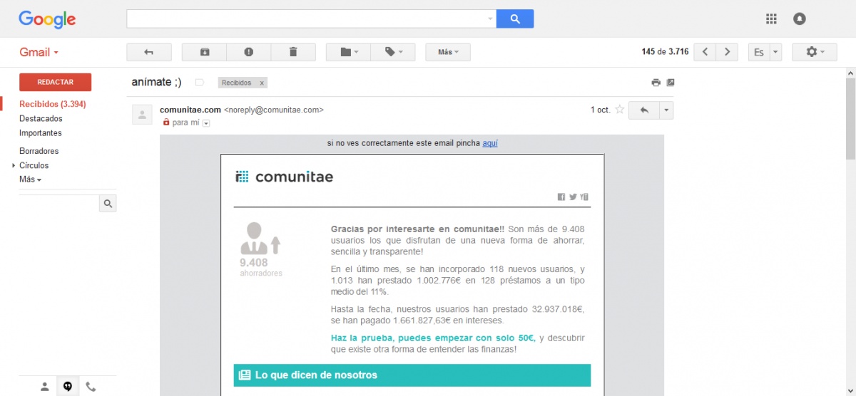 Desde hace mucho tiempo, Comunitae enviaba a los inversores un email a principios de mes bajo el asunto "animate" en el que indicaba que tal habían ido las cosas en el mes anterior. Indicaban el volúmen de préstamos intermediados, los nuevos clientes captados y algunos datos más.