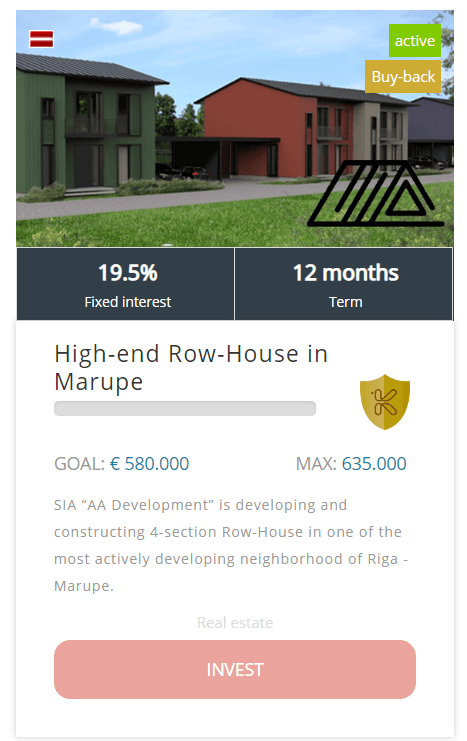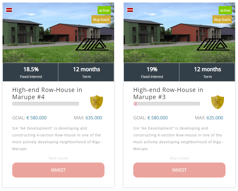 Se trata de dos préstamos (con garantía de recompra) de 580.000 € cada uno a la empresa promotora ALPA Būve https://aadevelopment.lv con sede en Letonia para la construcción de casas adosadas en el distrito de Marupe (Riga ). El proyecto se realizará con bloques Ecoterm, ideales para viviendas energéticamente eficientes. Las casas tienen 3 dormitorios, 3 baños, cocina, sala de estar y garaje para 2 coches. La misma promotora ha financiado con éxito otro proyecto en la plataforma. https://www.forofintech.org/velox-ro...-cashback-4691 Condiciones del préstamo: