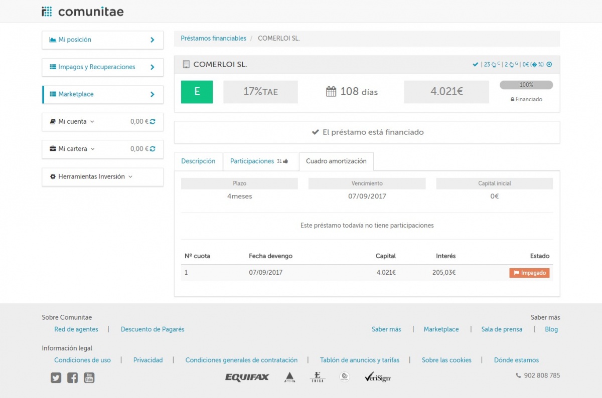 - Primero hay un primer préstamo de 8.042 € donde el inversor misterioso pone 4.021 €.
