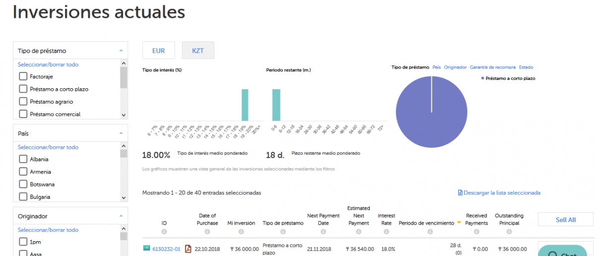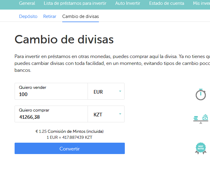 Tras mi visita a Kazajistán y la caída de interéses opté por los tenges en mintos. Dinero ofrece prestamos al 12% en EUR (como Varks) y al 18% en tenges, ambos a 30 días. Yo cambié para probar 1000 €, y ahora he puesto 5000€ en tenges. Obviamente pierdes en el cambio de divisa algo, pero definitivamente es la opción más rentable disponible. Os comento: Mintos utiliza la tasa de cambio REAL, pero te cobra un 1,25% de comisión, 1,25 de ida otro de vuelta son -2,5%. La divisa puede fluctuar yo compre a 1 EUR = 434 KZT, ahora he vendido a 1 EUR = 414 KZT, es decir 20/434 = +4,6% Luego 18% -2,5% (comisión Mintos *) tenemos un beneficio de 15,5% a lo que hay que añadir la fluctuación de la moneda, que puedes ser positiva o negativa, en mi caso ha sido +. * He cambiado divisa con mintos porque currency fair, paysera etc no me ofrecían tenges, mintos sí. En el caso de devaluación y "perder" no considero que estás perdidas sean tan grandes para no optar por el cambio del 12% EUR al KZT 18%. Mi caso concreto ha sido: 18 - 2,5 + 4,6 = 20,1% a 30 días. CONCLUSIONES. 1) Ventajas: Se obtiene mayor rentabilidad en KZT, aún con cambio y devaluación de divisa. El plazo es de 30 días 2) Inconvenientes: El originador (Dinero.ua) tiene una valoracion de C+. Sin embargo, apoyar a estos originadores (como Varks) que dan el máximo quizá haga que el resto de originadores incremente también sus intereses. 3) En el pasado den este foro se trato también inversión en lari (GEL), pero hoy por hoy la ganancia de interses no compensa. Las divisas supone una variación o incertidumbre, esto se puede llamar "oportunidad" o "riesgo" según como lo tomes. Quizás a veces lo uno aveces lo otro. He querido compartir esto con todo el foro, pero es mi experiencia. Si queréis podéis probar. Os dejo algunos pantallazos. Espero que os sea de utilidad. |