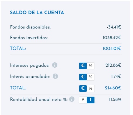 Pues que envie 1000€ hace una semana mas 4€ desde otra cuenta, totoal 1004, me meti a invertirlos manualmente sin actualizar la web y cuando termino y actualizo la web veo que me pone que he invertido 1039€, se lo comunico a viainvest y me dicen que he invertido 70€ en un prestamo cuando solo habia 35€ en cartera. y la solución que me dan es ponerme que les debo 34€ que van descontando de los intereses. es un peligro si se invierte lo que no se tiene.