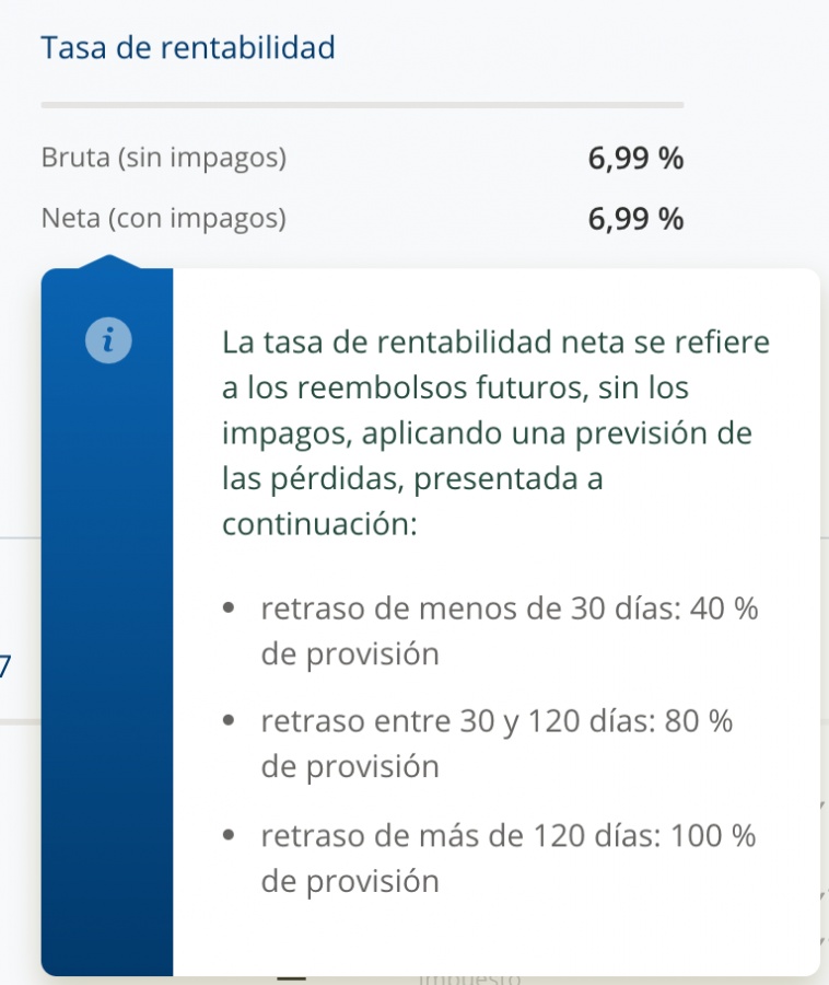 Gracias por tu respuesta y creo que hay varias cosas a mejorar, y voy a puntualizarte punto por punto: Sobre el apartado 1, después de la explicación te voy a dar la razón porque es una manera fácil de obtener los intereses netos (una resta), pero tú también me la tienes que dar, dado que no está de manera inmediata, que es lo que dije en el primer post. Sobre el apartado perdidas y retrasos, está muy bien la explicación que me das, pero ¿Dónde está la tabla donde aparecen desglosados las perdidas/retrasos en función de su estado? Eso falta. Actualmente tengo solo un préstamo en esta situación, por lo que es sencillo realizar el seguimiento, cuando tenga varios será imposible conocer si está en uno u otro estado de una manera rápida y visual. Por cierto, error de bulto no tener contemplado un cuarto estado con el capital fallido, aquel que se dé como perdido e incobrable, como resultado de una sentencia judicial, quita, o perdida declarada judicialmente. Y esto me servirá para puntualizar en el último apartado. Gracias por la aclaración sobre que las empresas que se han declarado en situación de impago también entran en la categoría de “tiene más de 120 días de retraso, la provisión es del 100%”, lo desconocía y yo no he sido capaz de encontrarlo en toda la web. Patrimonio Lendix. Aquí el problema es que en la web no se hablan de provisiones, sino de perdidas, y claro no es lo mismo. Si en el apartado Ganancias, si ponéis que tengo X pérdidas, no sé que tengo que interpretar, ¿son pérdidas o provisiones?, o en un momento dado, tal y como está puesto podrían ser las dos cosas; además otro problema es vuestra interpretación de saldo vivo, para mi es el capital invertido pendiente de pago menos las perdidas ya declaradas como incobrables, no las provisiones. Se puede hacer un saldo vivo menos provisiones, pero mientras haya la posibilidad de cobrar todo o parte del capital, eso sigue siendo saldo vivo. El problema es que se ha querido hacer un cajón de sastre y meter en el mismo apartado perdidas y provisiones, cuando fiscalmente tienen tratamientos diferentes. Y en definitiva solo crea confusión, aparte de que no hay detalle de este apartado. Espero que sirva para las siguientes versiones.