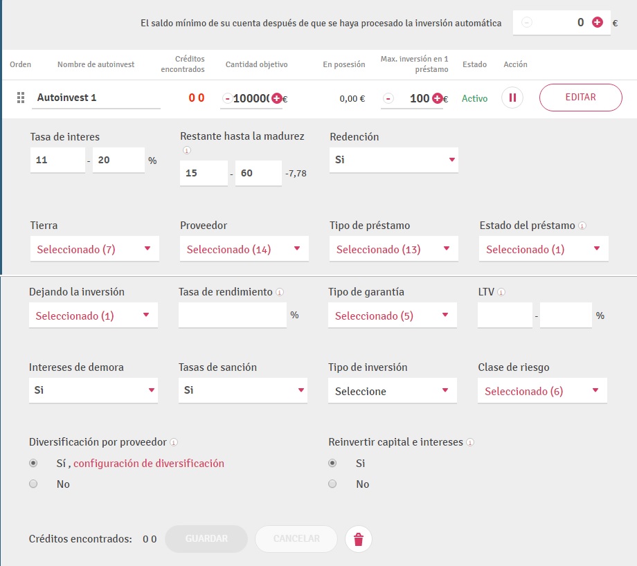 Hola, ¿como se configura el autoinves de bondster?, me han amortizado la mitad del capital y todo lo que ha salido a corto plazo ha desaparecido y no me ha cogido ninguno el autoinves, lo debo tener mal configurado. es bastante dificil la web, ademas de que no es practico que me salgan listas y listas de prestamos ya pujados y completados, me han dicho que no tienen aun un filtro para evitar los completados, un poco chapuzas no?, saludos