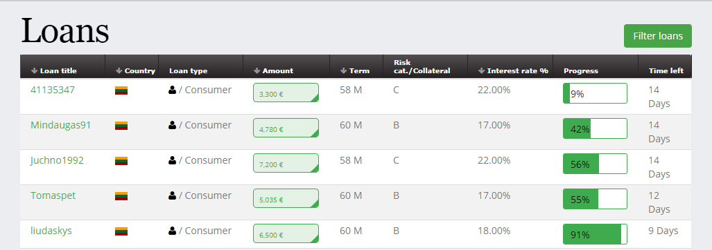 Configuración del auto-invest A la hora de configurar al automático, Finbee nos ofrece 3 configuraciones según diferentes niveles de riesgo: Conservative, Balanced, Progressive. Escogemos una y, editamos los parámetros para tener el auto-invest a nuestra medida. Finbee permite tener hasta 5 portfolios diferentes. General settings Una vez que hayamos creado nuestro primer portfolio, veremos un botón denominado "General settings". Se trata de uno de los ajustes más importantes pues debemos indicar a donde queremos que vayan (i) los depósitos que hagamos así como (ii) los cobros de capital e intereses. Podemos escoger entre que vayan a nuestra cuenta o que vayan directamente a uno de nuestros portfolios. Invertir en modo manual Si queremos invertir tenemos que tener dinero en la cuenta. En nuestro caso, hemos enviado dinero, pero por defecto se ha ido a nuestro primer portfolio y nos apareceía que teníamos saldo "0". ¿Que hacer? Desde la sección de "AutoLend setting", puedes sacar dinero de iba a ser destinado a tu portfolio y enviarlo a tu cuenta para invertir en modo manual. Préstamos sin garantía de recompra La tasa de morosidad de Finbee en la actualidad es del 5,41%. Este importe se calcula dividiendo el importe total de préstamos con cuotas impagadas durante más de 90 días entre el total de préstamos emitidos. La web muestra los préstamos con un impago de más de 60 días, pero a partir de abril-mayo tienen mostrar los impagos de más de 90 días. Según nos ha manifestado el equipo de Finbee, las estadísticas de la web de Finbee muestran peores datos. Veamos el motivo con un ejemplo: un préstamo puede haber impagado 3 cuotas y estar en "Default", abonar dos cuotas y tener sólo una cuota pendiente y seguir apareciendo bajo el epígrafe "Default". Esto es, en los apartados "Arrears" y "Default" de la sección de estadísticas hay préstamos que han pagado alguna cuota. El estado del préstamo sólo deja de estar en "Default" y pasa a estar "Al corriente de pago" cuando abona todos las cuotas pendientes. Reclamación de préstamos morosos Este es el procedimiento de reclamación de préstamos con cuotas impagadas. En el supuesto de que el préstamo llegue a tener una cuota impagada 90 días, se da por terminado el contrato y pasa a vía judicial. Según nos manifiesta Finbee, el plazo medio de una sentencia son 2-3 meses (más rápido que en España) y posteriormente pasa a fase ejecutiva para embargar bienes del deudor (saldo en cuentas corrientes, propiedades, parte proporcional de la nómina...). No han tenido ningún caso de ningún deudor que se haya declarado insolvente. Porcentaje recuperado Finbee ha recobrado un 56% de todas las cantidades pendientes de 2016 y un 40% de las cantidades pendientes de 2017. El procedimiento de reclamación (extrajudicial y judicial) es gratuito para el inversor y, además, devenga intereses de demora para el inversor al mismo tipo de interés que el préstamo. Proceso de alta El proceso de alta es bastante sencillo. En el formulario de registro hay un apartado llamado "Create username", es tu alias y es visible cuando haces una inversión y será el concepto que debes indicar cuando haces las transferencias. ![]() Asimismo, la primera vez que accedes a tu área de cliente, debes cumplimentar un formulario relativo a las medidas de Prevención de Blanqueo de Capitales y adjuntar una fotocopia del DNI. Fiscalidad Según la legislación tributaria de Lituania, Finbee debe aplicar una retención del 15% sobre los rendimientos obtenidos a los no residentes e ingresarlo en la agencia fiscal lituana. Según Finbee, existe la posibilidad de tener una reducción y que sólo nos retengan un 10% de los beneficios: rellenando el modelo DAS-1 y enviando un certificado de residencia fiscal que podemos obtener a través de AEAT. Sin embargo, dado que el tipo impositivo de España es mayor (19% sobre los primeros 6.000 €) otra opción es que Lituania nos retenga el 15% y pagar en España el 4% de diferencia en el IRPF dado que España y Lituania tiene suscrito un convenio para evitar la doble imposición. Valoración Sí, se trata de préstamos sin garantía de recompra, pero ya sabéis que la garantía no es eterna y es bueno explorar otras alternativas. Efectivamente, son préstamos no pre-financiados pero el tiempo de fondeo no es muy alto y se irá reduciendo más a medida que la base de clientes aumente y se compensa con la rentabilidad ofrecida. Nos parece muy positivo el hecho de que todos lo préstamos se firmen presencialmente, dado que evitas parte de las fraudes de las plataformas p2p como es la usurpación de identidad. Asimismo, la inversión de sólo 5€ por préstamo permite construir una cartera diversificada con poco capital. La morosidad es intrínseca a cualquier plataforma de crowdlending, pero la tasa de morosidad del 5,41% está muy controlada. Esto, unido a los altos intereses que abonan y la tarea de recuperación en la que también se generan intereses de demora, hace que sea una plataforma muy interesante. Aquí teneís un testimonio de otro inversor que lleva más de dos años en Finbee: En base a nuestra experiencia sabemos que (i) los préstamos de larga duración tienen más riesgo de entrar en mora porque las circunstancias del prestatario pueden cambiar y (ii) que en caso de impago, es más fácil de recobrar un préstamo de bajo importe que uno préstamos elevados. Por tanto, hemos empezado en modo manual con dos premisas: préstamos de bajo importe y con la menor duración posible. 【 Empezar a invertir en Finbee 】