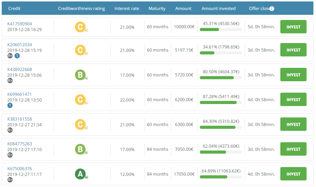 Ofrecen préstamos personales con una duración media de 48 meses. La plataforma tiene 9.400 inversores que han financiado más de 44 millones de euros, y han obtenido una rentabilidad media es del 17% anual ![]() Existe la posibilidad de contratar por un coste adicional que te cubre en caso de impagos. Ventajas: Es una plataforma supervisada por el Banco de Lituania y tiene mercado secundario. Desventajas: Es un poco compleja de usar. Los plazos son largos (48 meses de media) y hacen retenciones sobre los intereses cobrados. 【 Bonificación 25 euros para nuevos clientes 】