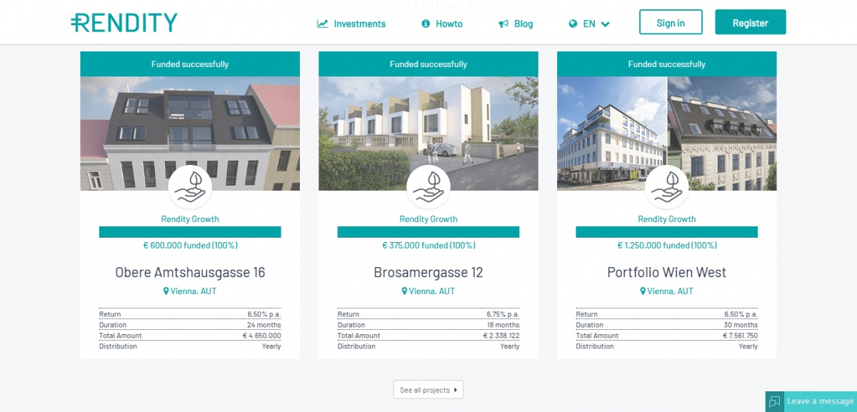 Rendity es una plataforma de crowdfunding inmobiliario fundada en 2015 en Viena que ha financiado 35 proyectos por importe de € 19M y una duración media de 26 meses.