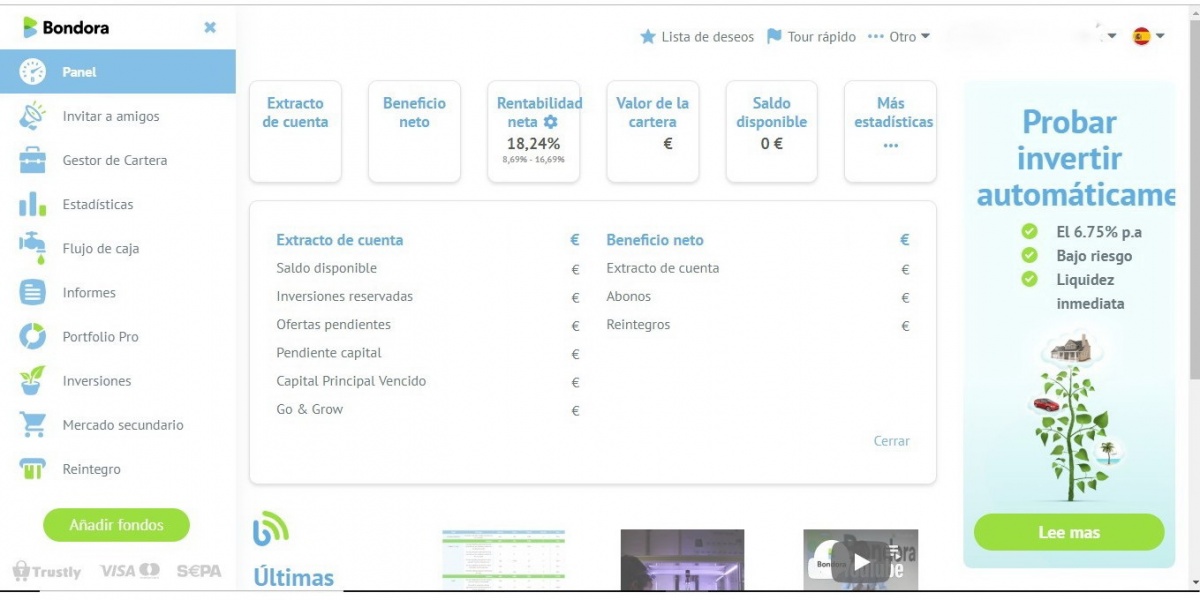 Ya se que toda la información que puedas encontrar en internet tiene su sesgo, pero Bondora lleva ya mucha andadura, y muchas opiniones. Desde la plataforma te pueden invitar a opinar, pero no obligar. Mintos tambien nos invita...... Bueno yo de momento estoy contento. Es una participación mas dentro de la diversificación, pero repito que me sorprende la capacidad inusitada de recobro que tienen..... Es cierto que en mi caso hay un extra de rentabilidad por el trading aunque ya digo que la compra no les va habitualmente......, "The system is under heavy load right now... bla, bla, bla.... pero vamos como Mintos que es mi numero 1 y hoy estan otra vez "petaos" y me tienen parados 600 €uretes... es lo que hay........ Reitero mi opinión, para gente curtida, con un poco mas de experiencia y conocimiento que el promedio, Bondora va muy bien.... Saludos, |