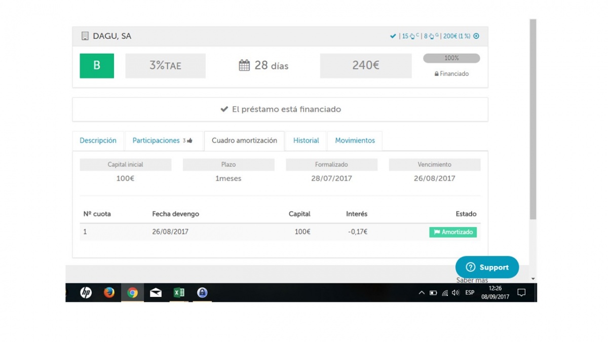 aviso a navegantes. En mi caso se me ha abonado el CPP 17314 de la empresa DAGU SA y me han abonado el capital pero debe de haber un fallo y me han cobrado a mi los intereses. Ya lo he reclamado, el problema es que no puedo acceder a mi cuenta ahora para poner un pantallazo (no me acepta las claves, es algo que me ocurre de vez en cuando en comunitae). |