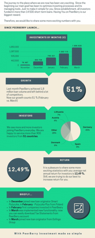 +900 inversores de 51 países Rentabilidad media: 12,49% anual Volúmen +51% (Marzo vs Febrero 2018) No extraña tanto teniendo en cuenta que la plataforma ha sido impulsada por Aventus Group, sólido grupo financiero constituido en 2009 y con fuerte presencia en Letonia, República Checa, Polonia, Georgia, Ucrania y Kazakhstan. Ya permiten la inversión de empresas y han empezado a incorporar nuevos originadores. Enhorabuena y a seguir creciendo Más información: www.peerberry.com