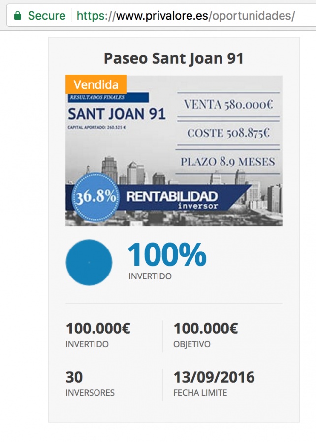 https://www.privalore.es/paseo-sant-joan-91/ (pinchar en actualizaciones) En el listado es donde pone que dio una rentabilidad de 36,8%, adjunto foto de ello.