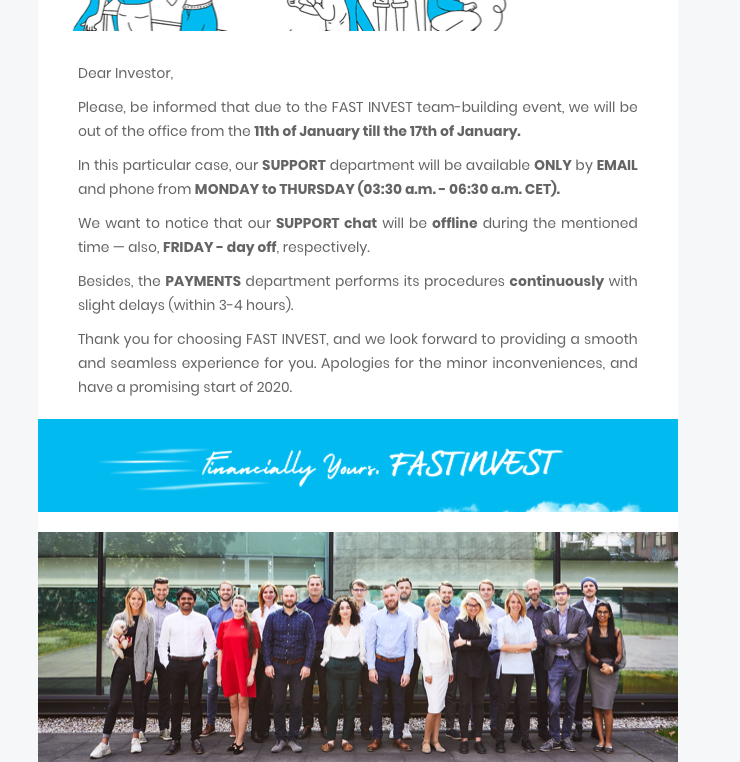 Recibido el 10 de Enero. Estimado inversor Tenga en cuenta que debido al evento de creación de equipo FAST INVEST, estaremos fuera de la oficina desde el 11 de enero hasta el 17 de enero. En este caso particular, nuestro departamento de APOYO estará disponible SOLO por CORREO ELECTRÓNICO y por teléfono de LUNES a JUEVES (03:30 a.m. a 06:30 a.m. CET). Queremos notar que nuestro chat SUPPORT estará fuera de línea durante el tiempo mencionado, también, el VIERNES, día libre, respectivamente. Además, el departamento de PAGOS realiza sus procedimientos continuamente con leves demoras (dentro de 3-4 horas). Gracias por elegir FAST INVEST, y esperamos brindarle una experiencia fluida y fluida. Disculpas por los inconvenientes menores, y tienen un comienzo prometedor de 2020. |