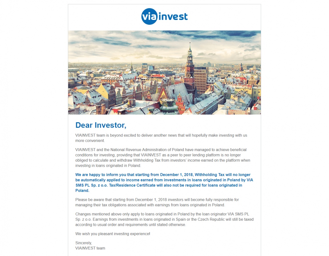 Desde el 1 de septiembre de 2018 no era necesario aportar el certificado de residencia fiscal para las autoridades de Letonia. Ahora, desde el 1 de diciembre de 2018 tampoco es necesario aportar el certificado de residencia fiscal para las autoridades de Polonia. ¿Que significa esto a efectos prácticos? Que cualquier inversor que esté interesado en invertir en préstamos de Polonia y Letonia, podrá hacerlo sin subir ningún certificado de residencia fiscal y Viainvest no practicará ninguna retención sobre los beneficios obtenidos. Sólo en caso de invertir en préstamos de la República Checa y España es necesario adjuntar un certificado de residencia fiscal. Me parece una estupenda decisión porque me consta que hay gente que ha descartado la plataforma por el tema del certificado fiscal. Si no tenías Viainvest en tu portfolio, es un buen momento para incorporarla; existen miles de préstamos donde puedes invertir sin necesidad de certificado. Más información: www.viainvest.com 【 Empezar a invertir en Viainvest 】